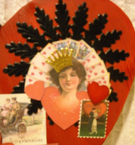 And now the fun began! I started by choosing the Queen of Hearts collage sheet and cut out one of the little beauties. She is backed with a German scrap spiky flower and also sports a German scrap crown. Black lace made a nice background to highlight the game tiles.