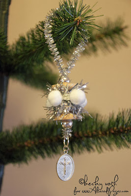 Here, I wrapped a small spool with tinsel (the loose kind), trimmed it up & then added the pom-pom trim. Then I threaded a silver tinsel pipe cleaner thru the opening in the spool & hung a Saint Medal Charm on the end.