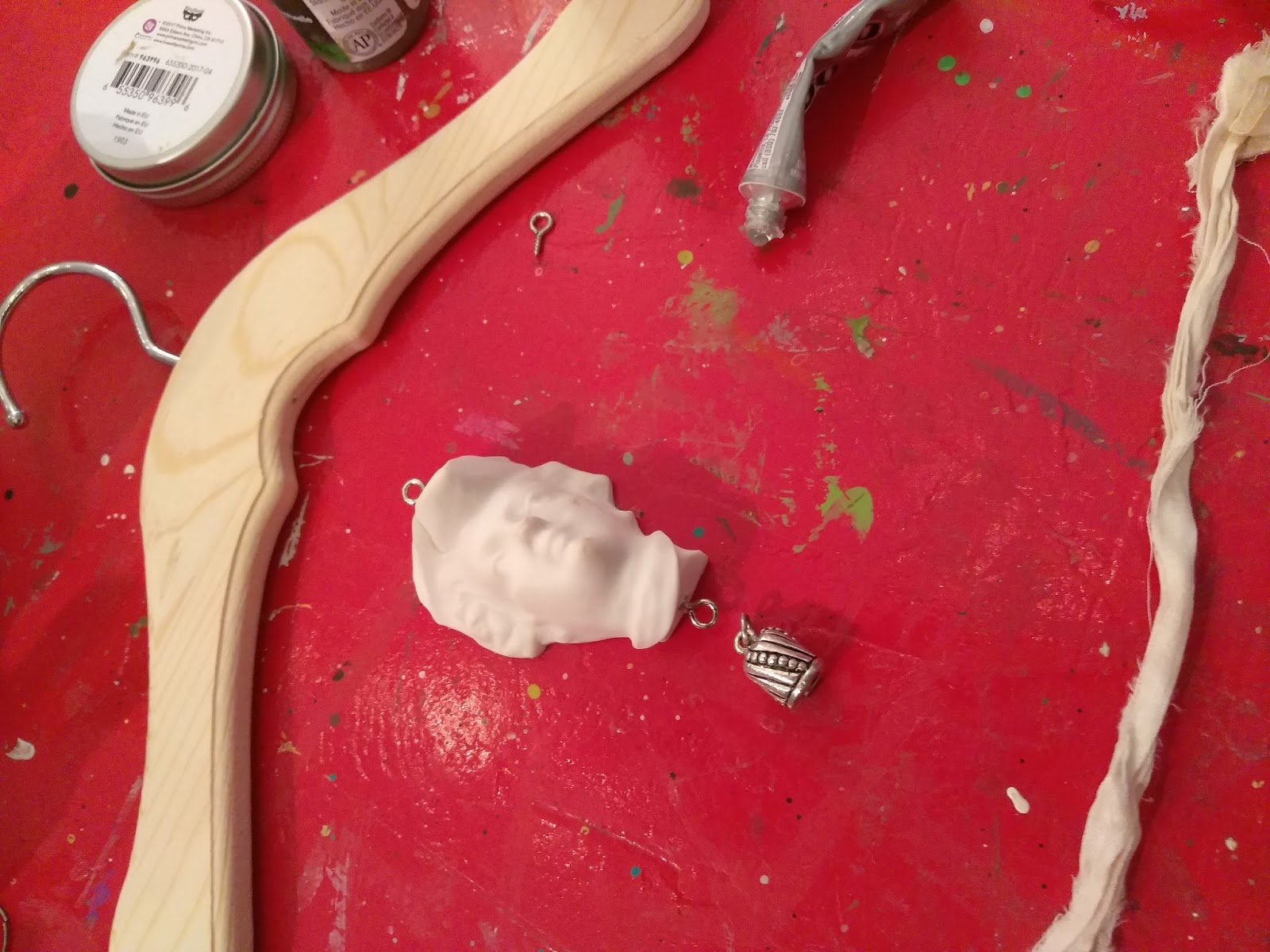 I used an awl to poke a starter hole in the bottom of the hanger and used an eye screw. I used glue in the hole before putting the eye screw in to ensure it would hold. My resin piece came with a hook in it but I added one to the bottom of it as well, so I can hang the bead cap piece with all my lace and ribbon in it, to the head piece.